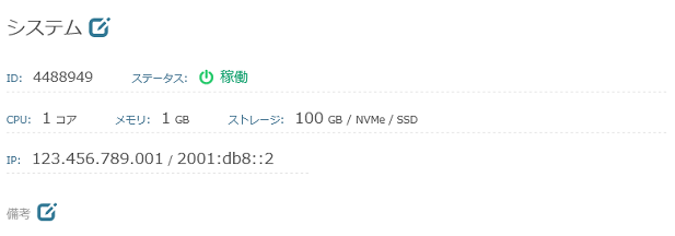 インスタンス名 インスタンスの管理用の名前が表示されます。 ID インスタンスの管理用のIDが表示されます。 ステータス インスタンスの状態が「停止」「稼動」のいすれかで表示されます。 - ※ 作成直後は「停止」と表示されています。