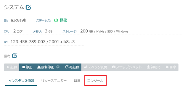 当社コントロールパネルからインスタンスに対し、コンソール接続することができます。リモートデスクトップ接続ができなくなった場合などにご活用いただけます。